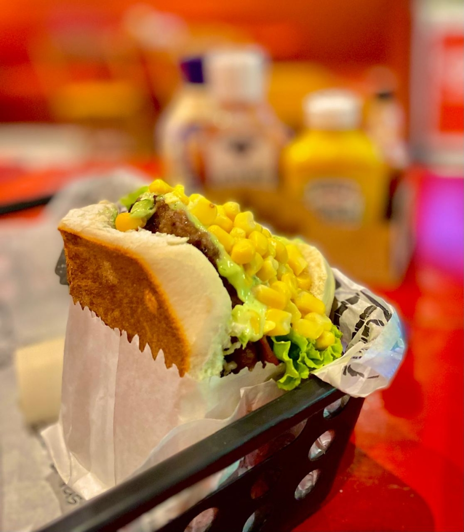 Pão, milho, queijo, maionese, 1 salsicha, molho e batata palha