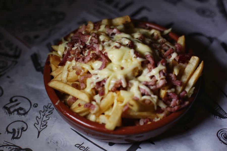 Porção 300g, bacon, queijo Cheddar, maionese caseira .